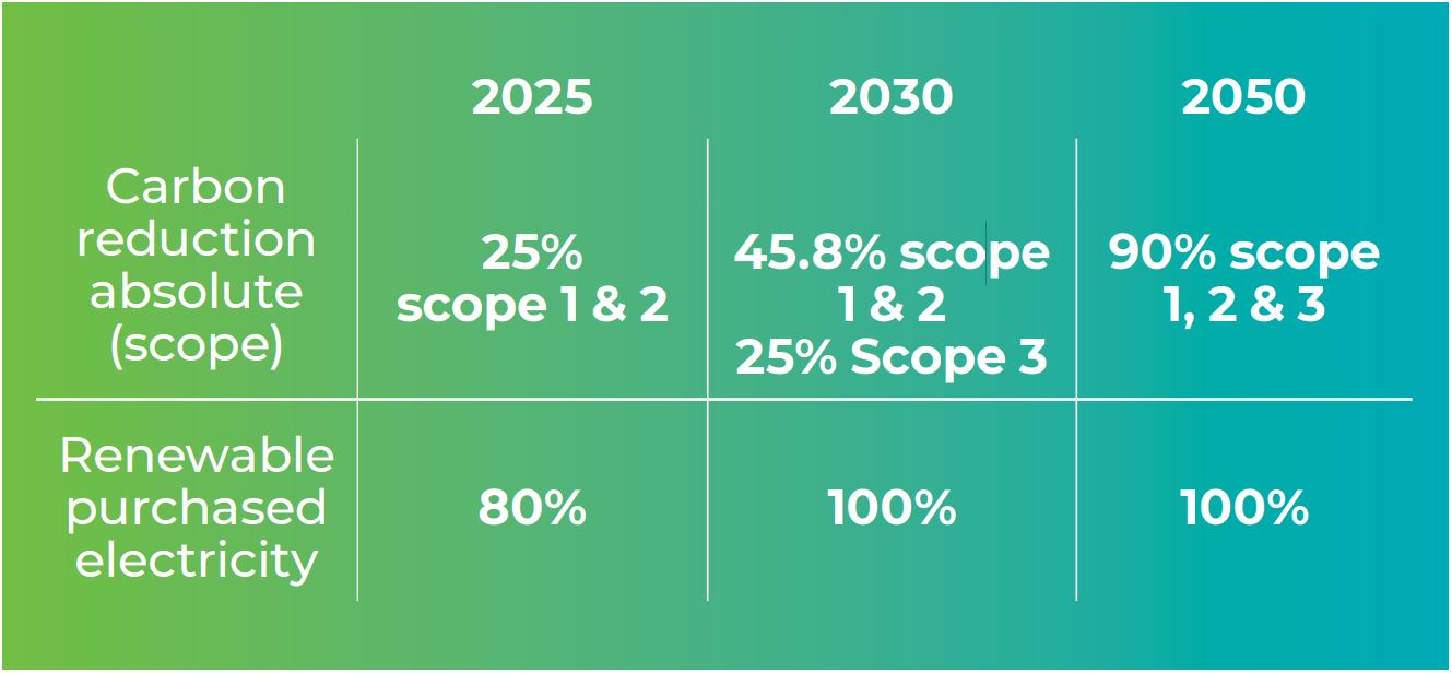 Our sustainability targets have been aligned with the Science Based Target initiative (SBTi) regarding energy, setting near and mid-term and Net Zero targets aligned to a 1.5oC increase in climate temperature change in line with the Paris Agreement. We have set interim Scope 1 & 2 targets for 2025 and 2030 against a 2020 base year and we have set Scope 3 targets against a 2024 base year. Those years were chosen as the reference years for which we have reliable data, in line with the SBTi Net-Zero Standard. By Net Zero we mean reducing our Scope 1, 2, and 3 emissions to at least 90% with any residual emissions neutralised through the permanent removal and storage of an equivalent amount of carbon from the atmosphere.